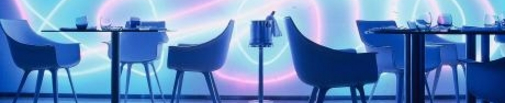 Karim Rashid has an innovative approach to combining texture, materials and colour. Coloured concrete, ceramic tiles, dark wood, epoxy, metal and rubber floors and colured glass are found throughout the hotel. Modern art gallery throughout public areas; LEDs and other digital projection media throughout hotel. |